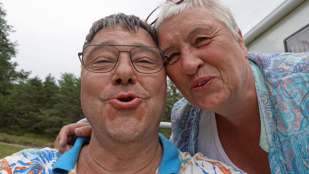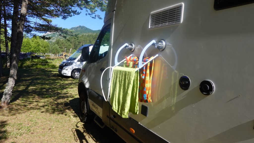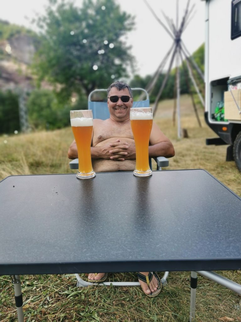 Zurück auf Stellplatz war duschen angesagt. Das erste Mal mit unserem Duschzelt. Aufgebaut in 2 Minuten – geduscht mit kaltem Wasser mit abtrocknen in 3 Minuten – abgebaut und wieder zusammengefaltet 100 Minuten mit Fluchen 😤😠 und Schimpfen und Hilfe von unseren Schweizer Nachbarn. Ein älteres 80 jähriges Ehepaar mit einem schweizer Sprinterausbau. Am Schluß haben wir/Bernd es doch noch geschafft. Das 2x1x1Meter große Zelt wieder zu 3 Ringen mit einem 60cm großen Durchmesser zu legen. 👏👏👏