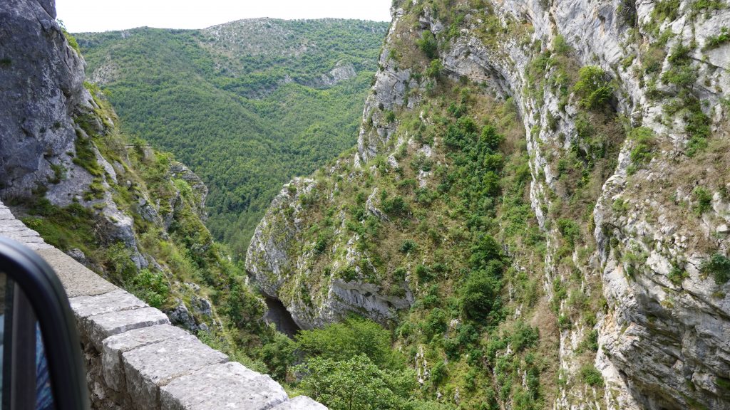 Gorges du Verdon, auch Grand Canyon du Verdon, Département Alpes-de-Haute-Provence. Sie beginnt flussabwärts nach der Stadt Castellane und endet nahe Moustiers-Sainte-Marie im Stausee Lac de Sainte-Croix. Wir fahren sie diesmal flußaufdwärts. Durch den etwa 21 km langen und bis zu 700 Meter tiefen Canyon fließt der sonst türkisfarbene Fluss Verdon, der aber durch die vielen Regenfälle in den letzten Wochen in den Bergen sehr schlammig aussah. Die Verdon- sind neben der Tara- und der Vicos-Schlucht einer der größten Canyons Europas und Hauptbestandteil des nach ihm benannten Regionalen Naturparks Verdon. Und unsere nächsten Reiseziele.