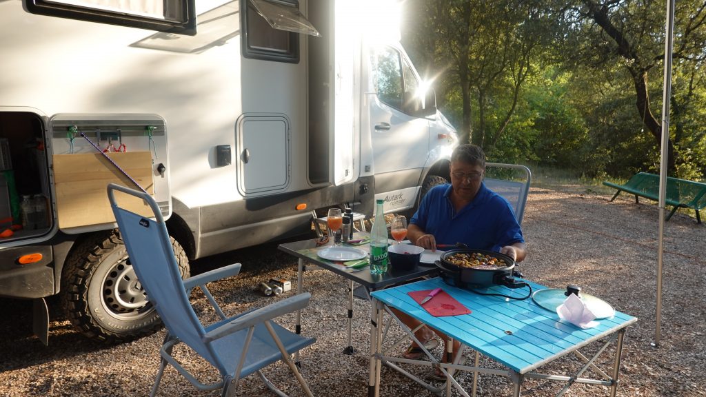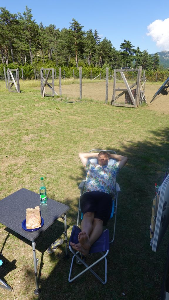 🛏 Campingplatz am Fluß Var; Wetter 🌞X 🌡️unter 2o°C auf den Bergen, 34°C in den Tälern; Stimmung: 😁; Essen: Mittagssnack mit Hühnchen, Abends leckere Pasta;