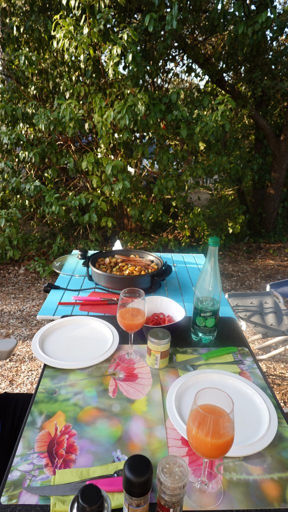 🛏 Campingplatz ohne See oder Fluß am Rand eines kleinem Ort; Wetter 🌞X 🌡️35°C am Tag und endlich bis Mitternacht draußen sitzen – endlich Sommer😎😚 ; Stimmung: 😁; Essen: Mittagssnack, Abends: Campariorange zum Start, gegrillte Kartoffelpfanne mit Bratwurst,🥖 und Gemüse und natürlich lecken Wein dazu;