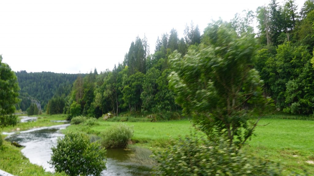 Der Fluß Doubs begleitet uns auf der Hin- wie auch Rückfahrt ein großes Stück durch das Jura. Er ist ein abwechslungsreicher rund 453 Kilometer langer Wild- und Wanderfluss im Grenzgebiet von Frankreich und der Schweiz, wobei Quelle und Mündung nur etwa 90 Kilometer voneinander entfernt liegen. Er entspringt südwestlich von Pontarlier in einer Quelle auf ca. 940 m Höhe und verläuft auf zunächst 140 Kilometer bis zum Städtchen Saint-Ursanne in nordöstliche Richtung. Auf diesem Wege fliesst er zunächst durch eine hochgelegene sanfthügelige, zumeist von Landwirtschaft geprägte Landschaft. Später verläuft der Fluss durch schöne, teilweise einsame Waldtäler. Ändert seine Richtung und fließt dann etwas östliche Richtung in die Schweiz hinein und kommt nach 29 km wieder nach Frankreich. Bei Besancon ändert er wieder die Richtung nach Südwesten um nordöstlich von Chalon-sur-Sâone in die Sâone zumündet.