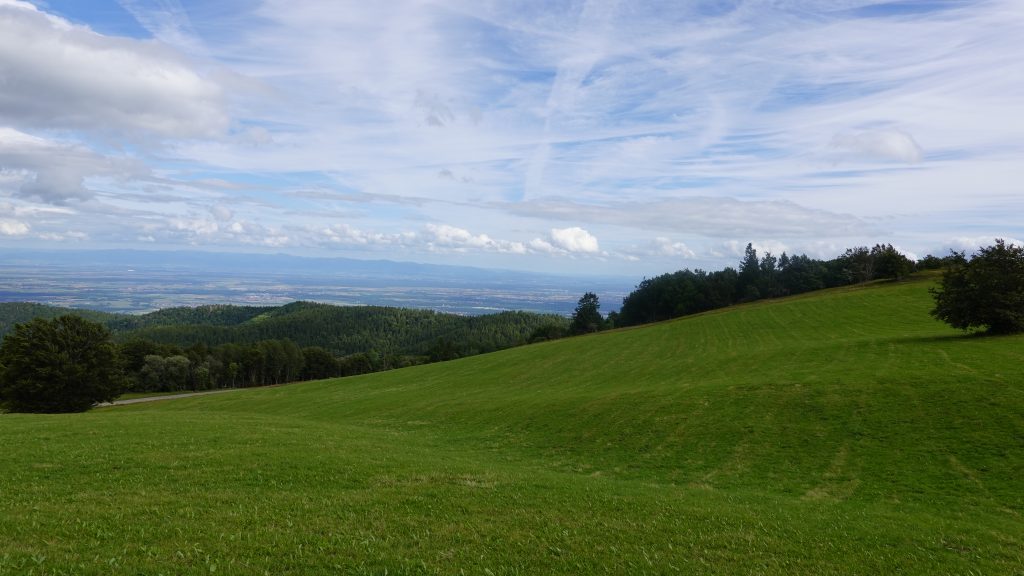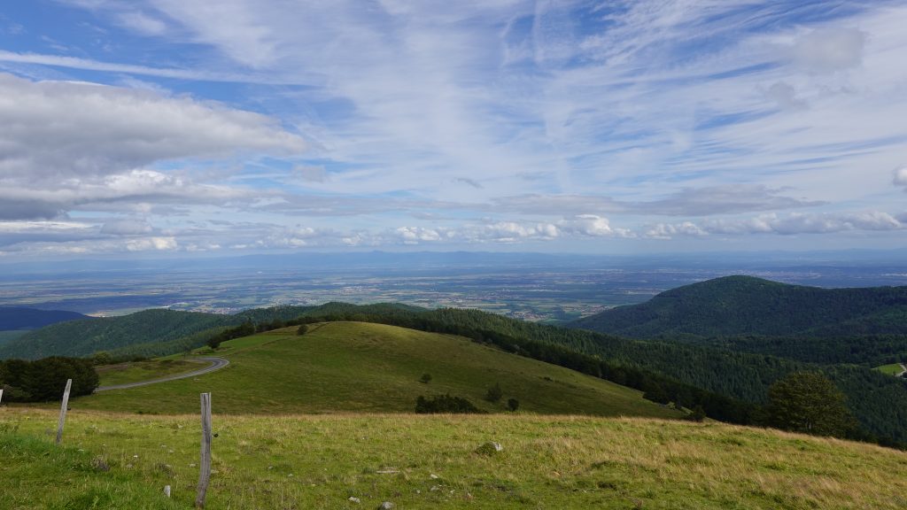 Meist säumen Laub- und Mischwälder die Straße, oder es bieten sich herrliche Ausblicke auf die bewaldeten Hänge der Vogesen, auf die Rheinebene und den gegenüberliegenden Schwarzwald. An klaren Tagen reicht die Fernsicht bis zu den Schweizer Alpen und dem Montblanc. Heute aber leider nicht, weil es mal wieder regnet.
