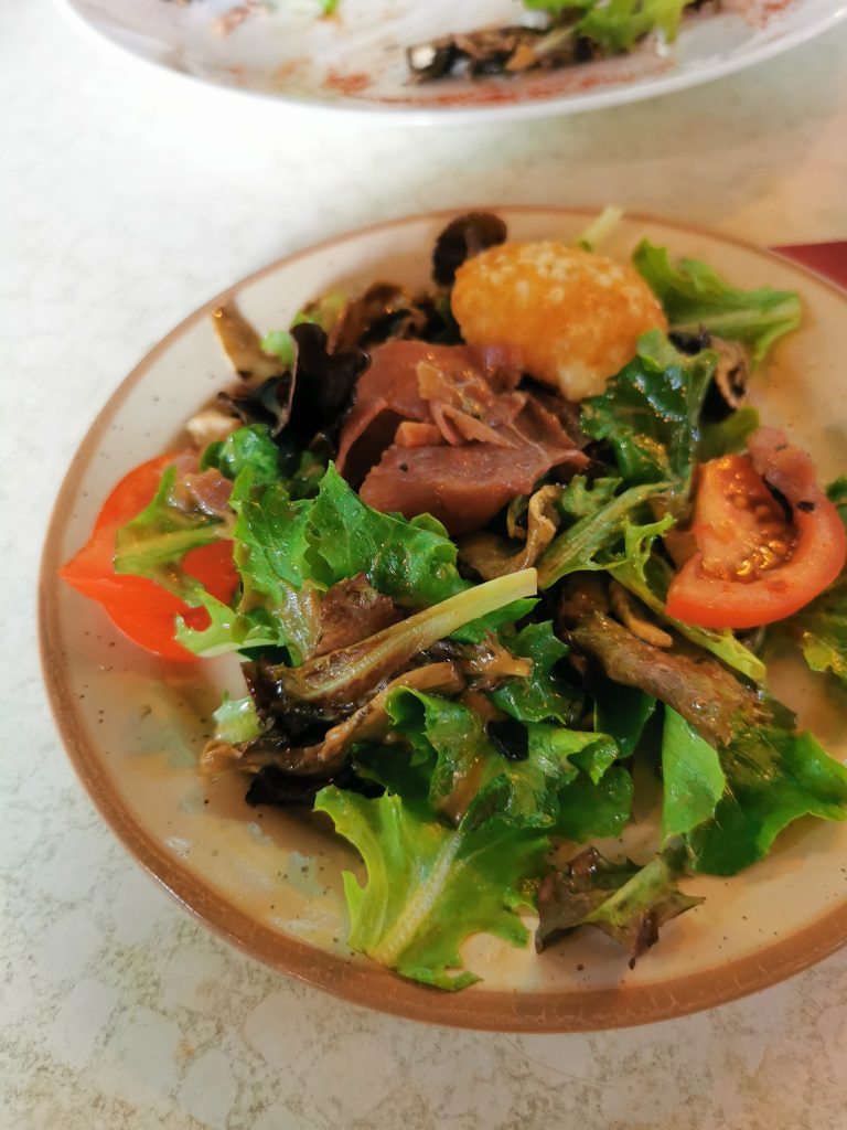 🛏 Stellplatz auf dem Campingbauernhof; Wetter 🌞X 🌡️2o°C auf den Bergen 32^C in den Tälern; Stimmung: 😁; Essen: Mittagssnack, Abends Essen in der Auberge Foret – Salat mit Pilzen und Ziegenkäse, Entrecote mit verschiedenen Gemüse.