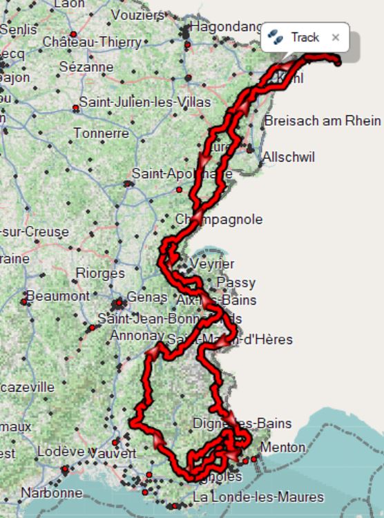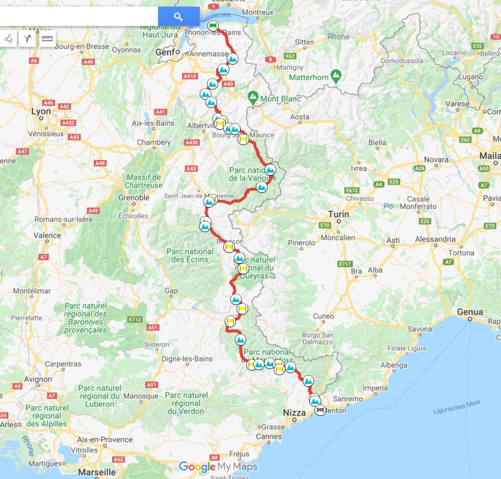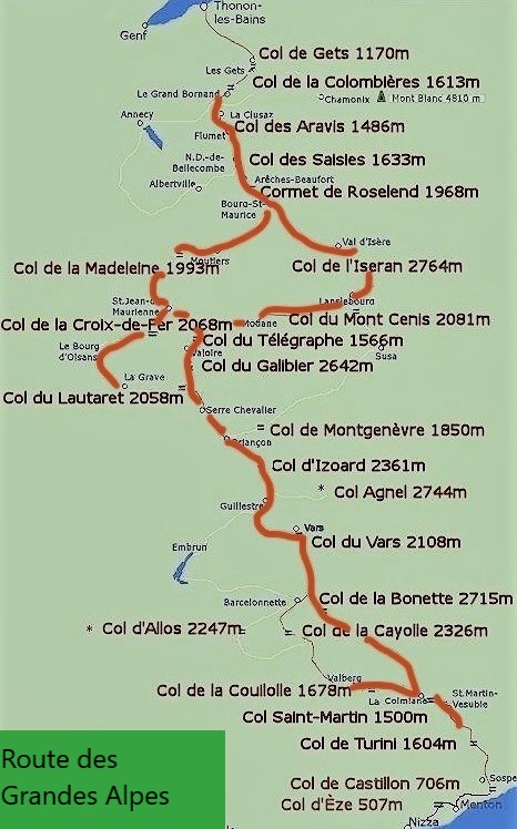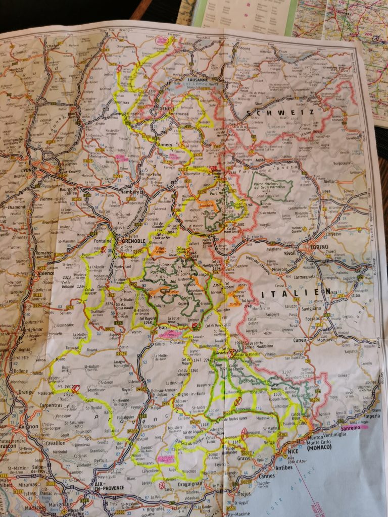Col des Aravis (1487 m), Col des Saisies (1650 m), Cormet de Roselend (1967 m), Col de l’Iseran (2764 m), Col du Télégraphe (1566 m), Col du Galibier (2645 m), Col de Resteford, Col de la Bonette, Col du Lautaret (2058 m), Col d’Izoard (2360 m), Col de Vars (2109 m), Col de Valberg (1673 m), Col de Rossette, Col de la Croix de Fer, col de la Madelene. Col des Gets (1163 m), Col de la Colombière (1613 m), Col de la Cayolle (2326 m) u. Alons, sowie Turini, Castillion und Eze fehlen dieses Mal.
