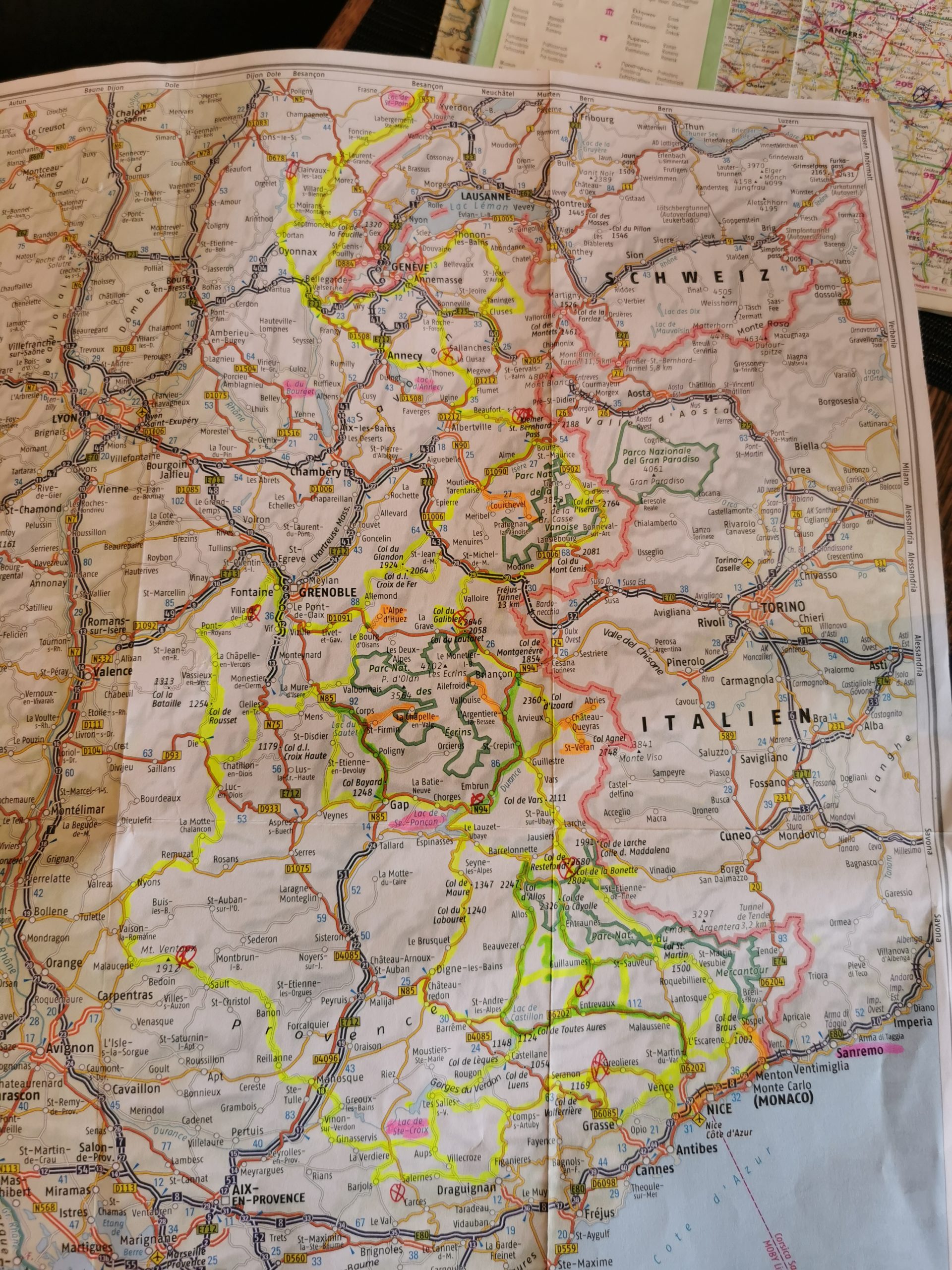 Col des Aravis (1487 m), Col des Saisies (1650 m), Cormet de Roselend (1967 m), Col de l’Iseran (2764 m), Col du Télégraphe (1566 m), Col du Galibier (2645 m), Col de Resteford, Col de la Bonette, Col du Lautaret (2058 m), Col d’Izoard (2360 m), Col de Vars (2109 m), Col de Valberg (1673 m), Col de Rossette, Col de la Croix de Fer, col de la Madelene. Col des Gets (1163 m), Col de la Colombière (1613 m), Col de la Cayolle (2326 m) u. Alons, sowie Turini, Castillion und Eze fehlen dieses Mal.