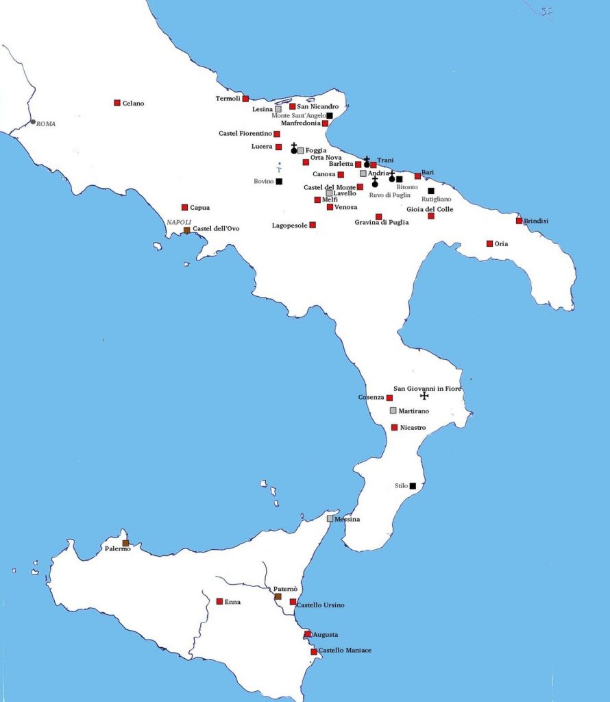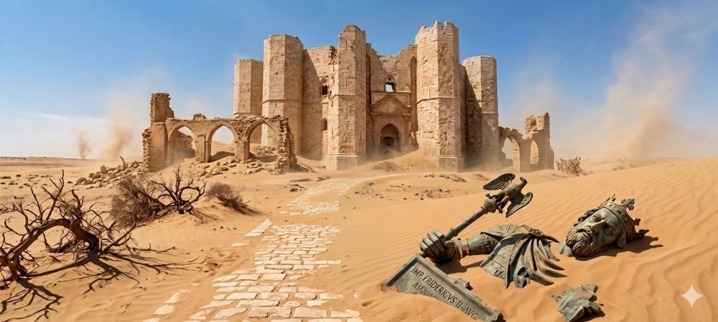 Unter Friedrich II., dem „Wunder der Welt“, wurde Apulien zum administrativen und kulturellen Zentrum des Reiches. Foggia diente als kaiserliche Hauptresidenz und in Lucera siedelte der Kaiser loyale sarazenische Truppen an und schuf damit eine einzigartige Militärkolonie. Das weltberühmte Castel del Monte bei Andria, gilt als vollkommener Ausdruck staufischer Baukunst. Die Küstenstädte Bari, Trani und Brindisi wurden durch massive Kastelle direkt am Meer gesichert. Als letzte Stationen gelten Cosenza (Kalabrien) und Enna (Sizilien). Auch hier finden sich weitere bedeutende Bauten der Staufer. Sizilien wurde zu einem Schmelztiegel der Kulturen, in dem arabische Wissenschaft, normannische Baukunst und staufischer Ordnungssinn aufeinandertrafen. Sizilien im 12. und 13. Jahrhundert – das war ja nicht einfach nur eine Insel, das war das pulsierende, intellektuelle Herz des Mittelmeers. Die Ära endete tragisch in Torremaggiore, wo Friedrich II. 1250 im Castel Fiorentino verstarb.